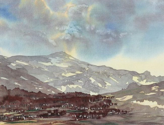 Generally, small and always simply stated, his paintings of Scotland may capture a rainstorm sweeping over a mountain scene, or in England, the fading light upon a pasture; his observations seek rare moments or impressions of the landscape – as though capturing the changing scenes of a dramatic play.