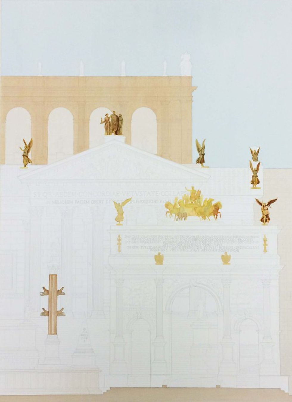 Professor Mayernik suggested I work on the gilt bronze statues and really get them to the correct value with shade and shadow so that I could use that as a datum to judge how much I needed to bring up the other values of the rendering.
