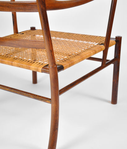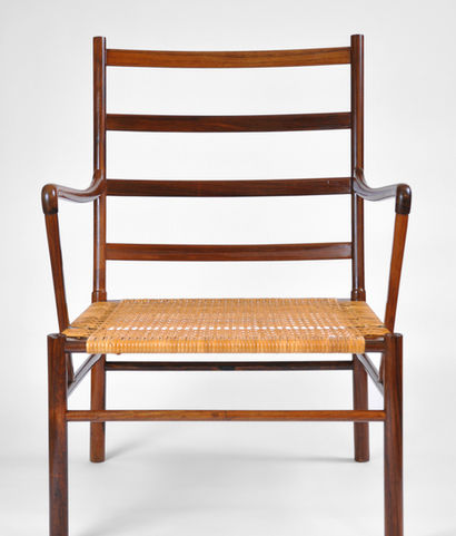 This early pre-production version of Ole Wanscher's PJ-149 Colonial Chair is crafted from highly figured, exotic rosewood. This design embodies Wanscher's deep appreciation for the aesthetics of 18th- and 19th-century British and French Colonial furniture. Born in 1903, Wanscher was a significant figure in the Danish modern movement. His education under the influential architect Kaare Klint profoundly shaped his design philosophy, which emphasizes a harmonious blend of modernist principles and traditional craftsmanship.